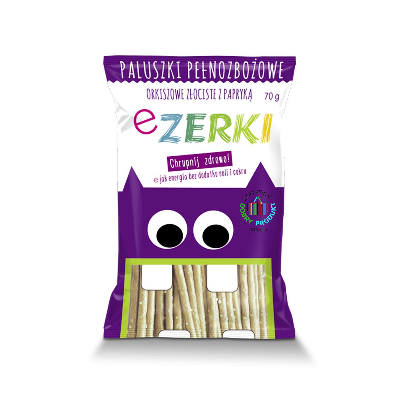 Ezerki jest to linia produktów marki Prosto group. Paluszki i wafle, które w swoich składach nie zawierają dodatku soli ani cukru. Powstały po to, aby najmłodsi konsumenci, mogli zjeść zdrową przekąskę w swoich szkołach, przedszkolach czy bibliotekach. Pełnoziarniste paluszki orkiszowe z papryką to idealna przekąska między głównymi posiłkami, na każdą porę dnia !Skład: Mąka pełnoziarnista orkiszowa 93%, drożdże rzepakowy tłuszcz roślinny, woda, regulator kwasowości - soda oczyszczona, sproszkowana papryka (5%). Bez cukru: BEZ CUKRU Bez laktozy: BEZ GLUTENU Vege: VEGAN